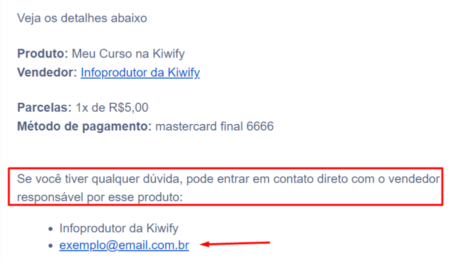 Quando você compra um produto através da plataforma Kiwify nós enviamos um e-mail com o título Pagamento Aprovado. Dentro desse e-mail você pode encontrar o contato do vendedor.